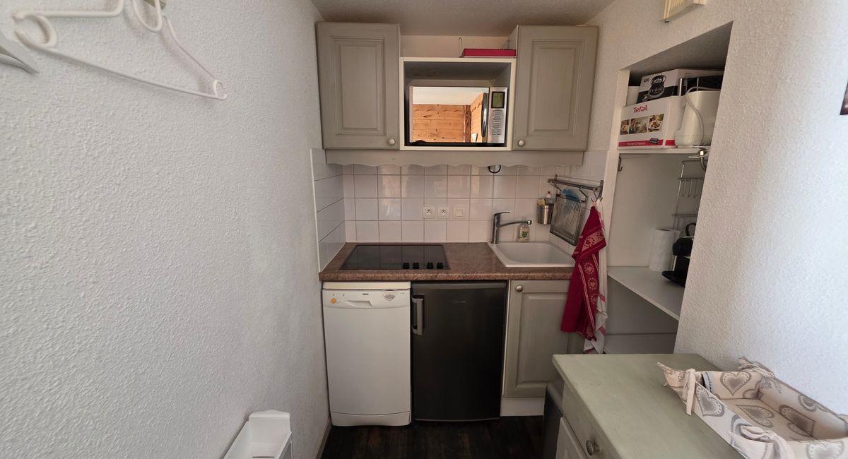 With a total area of 31m², the space includes a cozy living room with a convertible sofa, a kitchenette equipped with modern amenities such as a microwave, dishwasher, and espresso machine, and a bedroom with a double bed (140cm). Additional sleeping arrangements include two bunk beds in the mountain corner. The south-facing balcony offers stunning panoramic views of the surrounding valley.