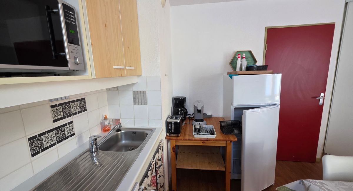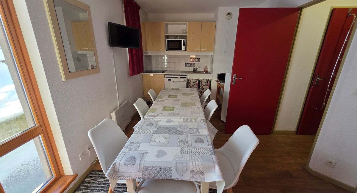 Inside, you'll find a cozy living area with a gigogne sofa, a fully-equipped kitchen, and bedrooms featuring a double bed (140cm) and bunk beds, making it perfect for families. Additional facilities include a ski locker, flat-screen TV, and available rental options for bed linen and towels. The village of Saint-François-Longchamp offers charming shops and restaurants, adding to the convenience and enjoyment of your stay.