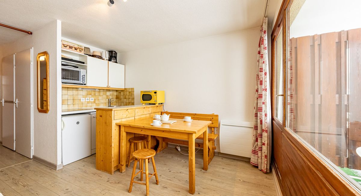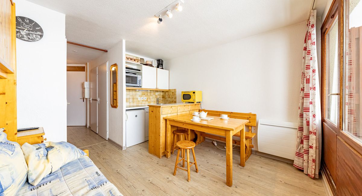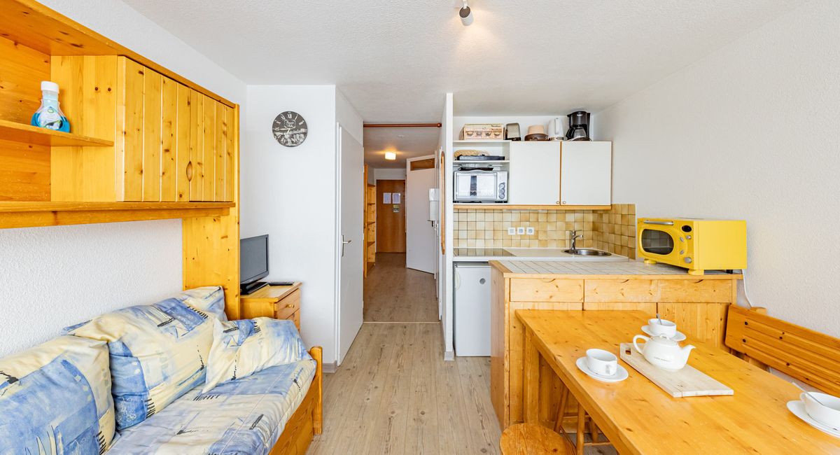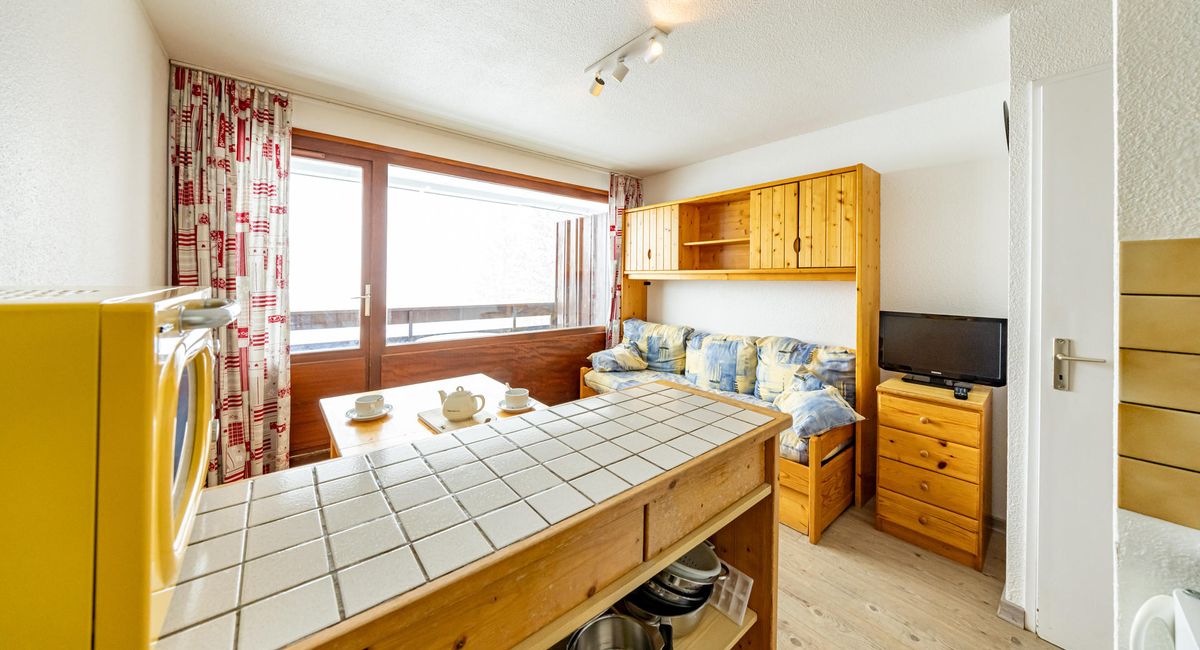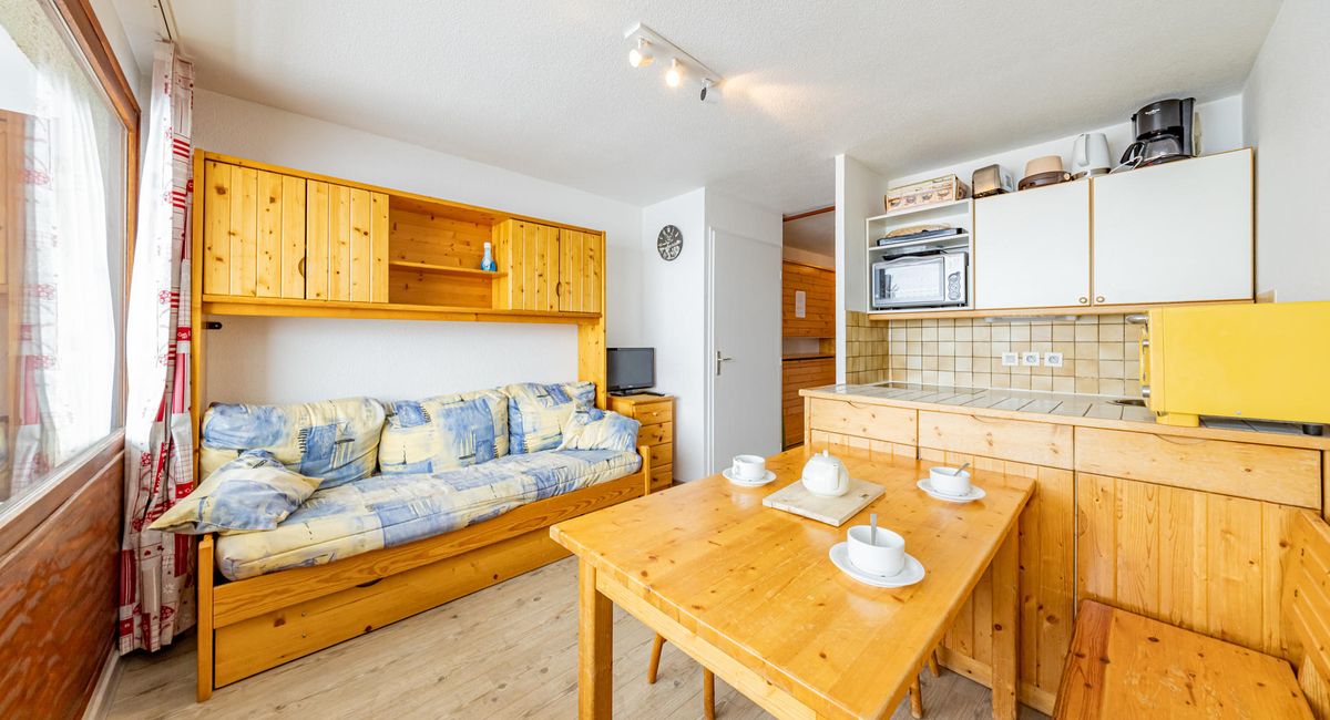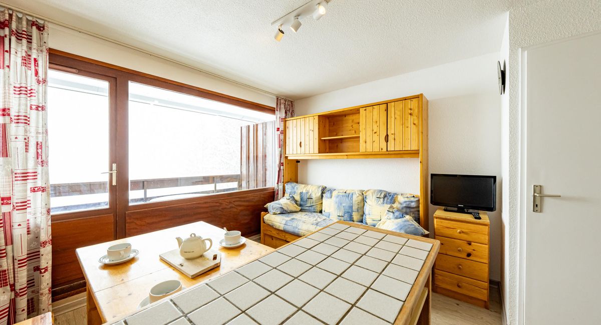 28sqm flat for 5 people with south-facing balcony, close to the slopes and shops.