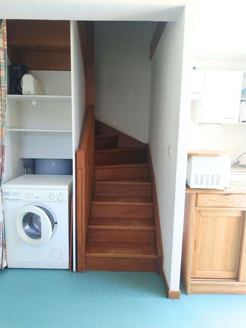 - A laundry area with washing machine at the foot of the stairs.