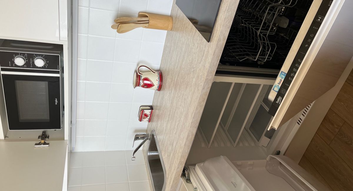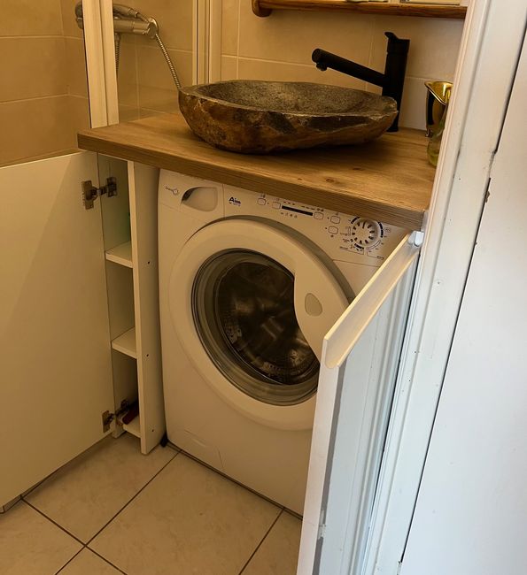 The bathroom has a shower and washing machine, and the WC is separate for added convenience.