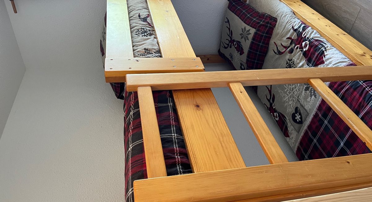 The living room has a sofa bed, while the sleeping area has two bunk beds.