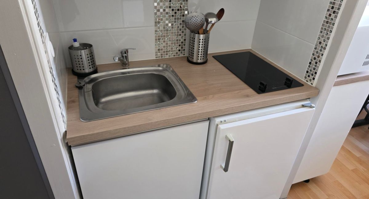 The flat has a kitchenette with electric hob, microwave, mini-oven, fridge and toaster.