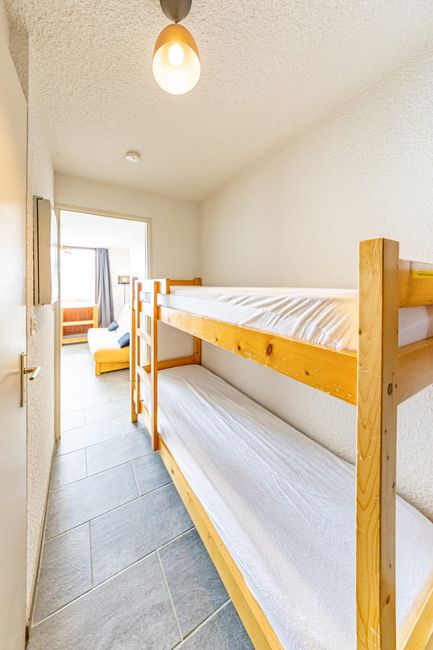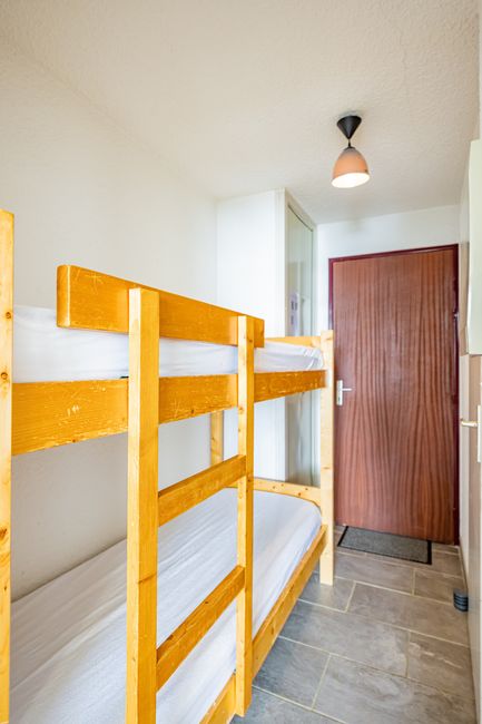 - Mountain area with bunk bed (sleeps 2, 90cm) separated from living room by door.