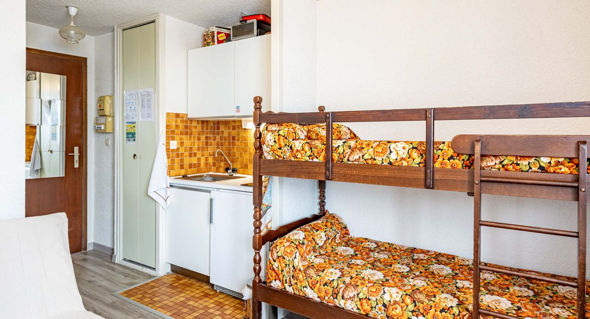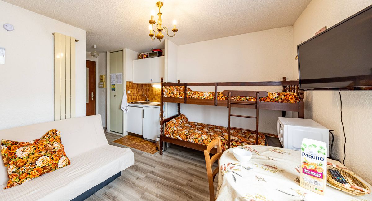 - Living room with 180cm sofa bed and bunk bed (sleeps 2), wall-mounted flat-screen TV.