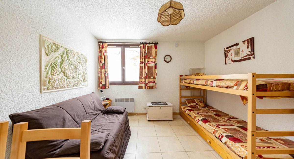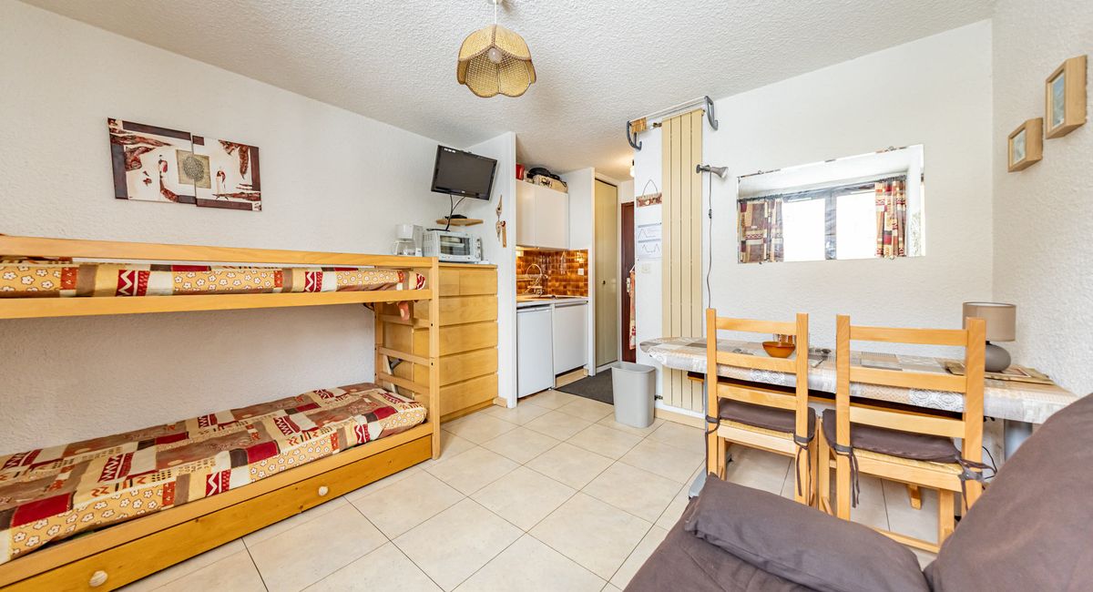 - Living room with 140cm BZ sofa and bunk bed (sleeps 2), wall-mounted flat-screen TV.