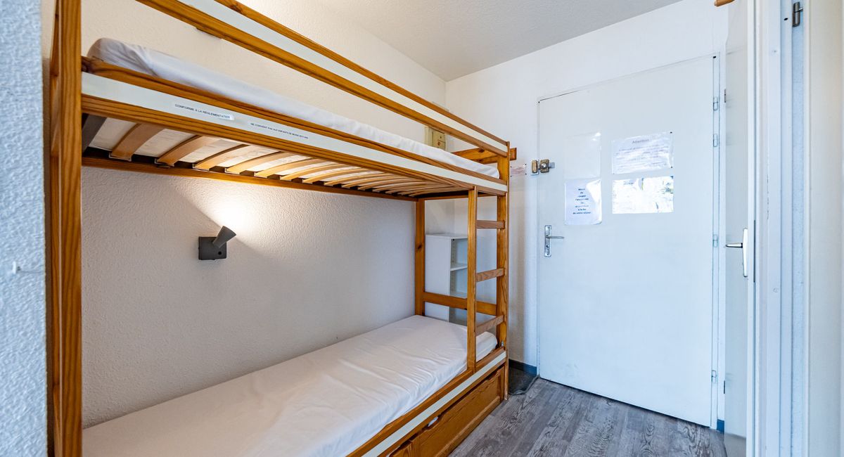 - Sleeping area with a bunk bed (sleeps two), separated from the living room by a curtain.