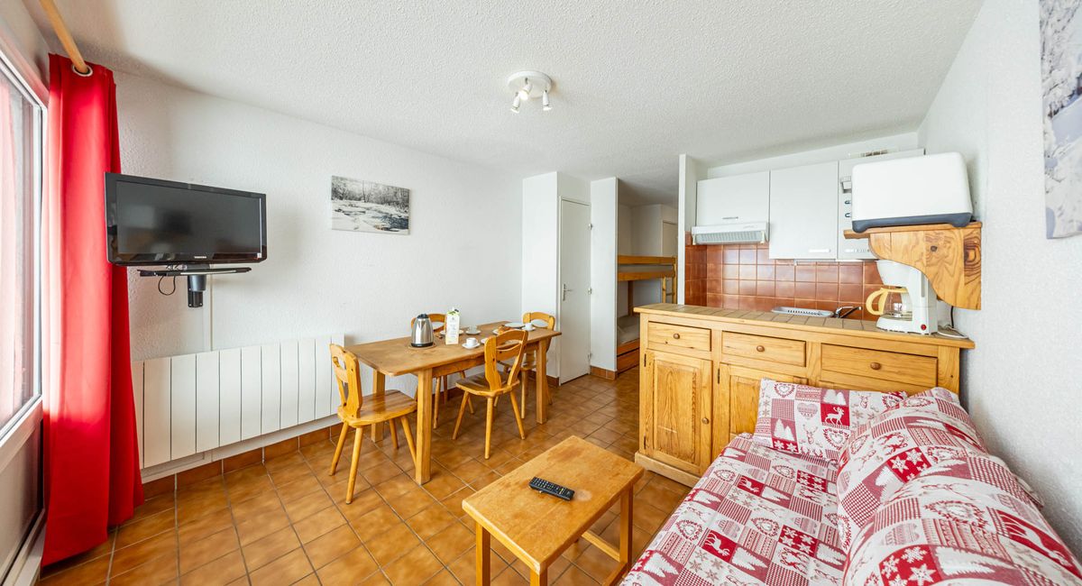 - Living room with pull-out sofa and wall-mounted flat-screen TV.