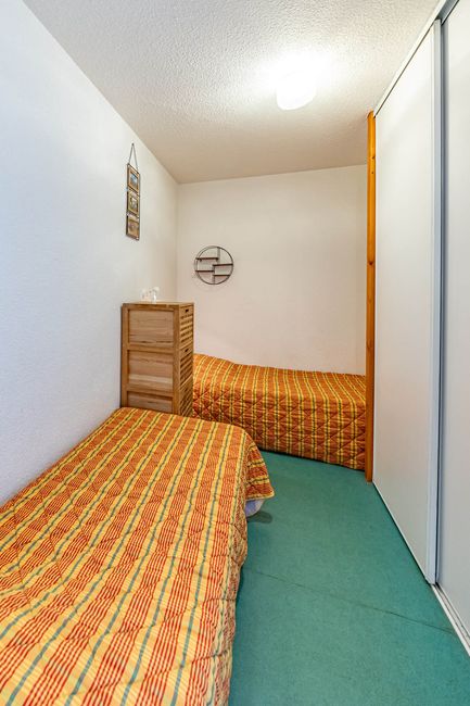 - Bedroom 1 with 2 single beds, separated from the living area by a curtain.