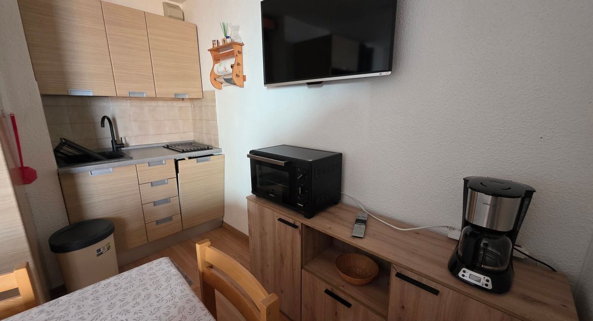 Welcome to this well-appointed 2-room flat in the Val Blanc 1 residence in Saint François Longchamp. Sleeping up to 4 people, the flat has a bedroom area with a double bed (140 cm) and a sofa bed in the living room and a mountain area with a bunk bed in the entrance hall.